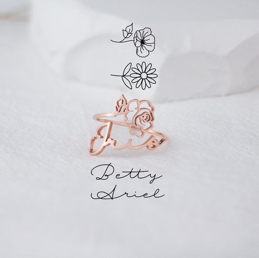 Personalized Birth Flower Ring with Name Engraving
